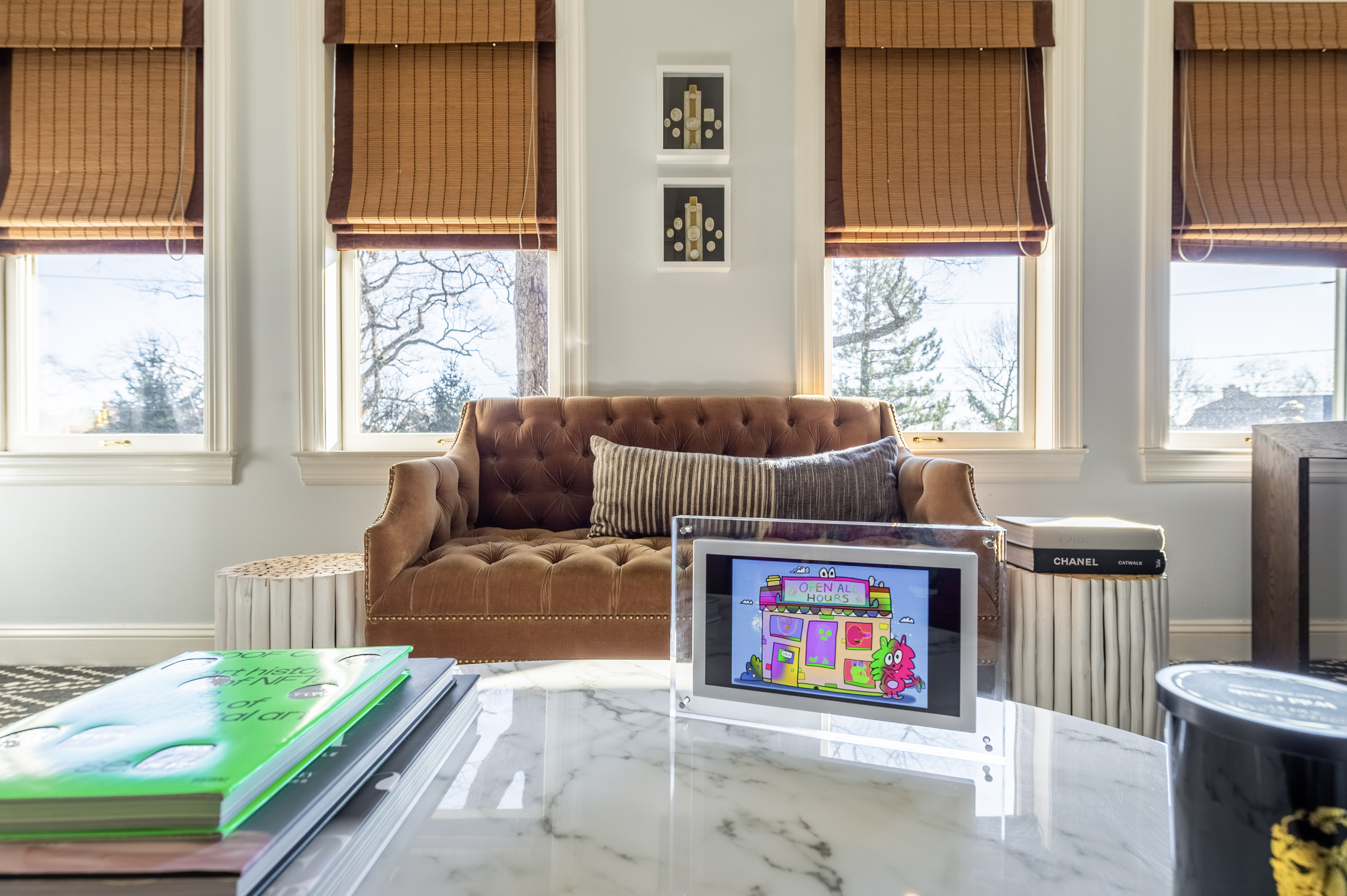 Here are some ideas to help you plan how to display your collection at home. To illustrate these examples, we're delighted to share exclusive images from The Edicurial Collection by Elsie, one of our supporting collectors. She graciously welcomed us into her home to show how she seamlessly integrates crypto art with traditional artworks within a 19th-century Hudson River artist studio home setting.