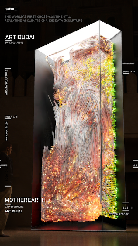 Also not to be missed is the monumental project MOTHEREARTH, presented by Ouchhh Studio in collaboration with DG Art Project and Gallery. Presented as the world’s first cross-continental AI data sculpture, MOTHEREARTH links real-time climate change data across three continents, connecting installations in Dubai, Beijing, and Mexico City. Fed by live data from NASA’s network of 20 satellites, the sculptures interpret and influence one another’s visual outputs in a synchronized global dialogue. Now making its Middle East debut at Art Dubai, this groundbreaking work transforms climate data into immersive visual poetry. With AI as its painter and satellite data as its palette, MOTHEREARTH constructs a collective portrait of our planet’s shifting rhythms, reminding us of our deep interconnection, and our shared responsibility to care for the Earth.