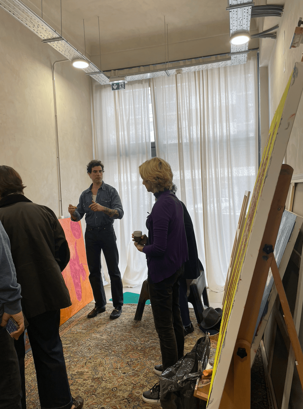 Collectors had the opportunity to closely observe works in progress, gaining insight into how compositions evolve. We discussed scale, repetition, figuration, abstraction, and how his visual language - informed by his background in graphic design - is being reinterpreted through a more tactile and painterly approach.