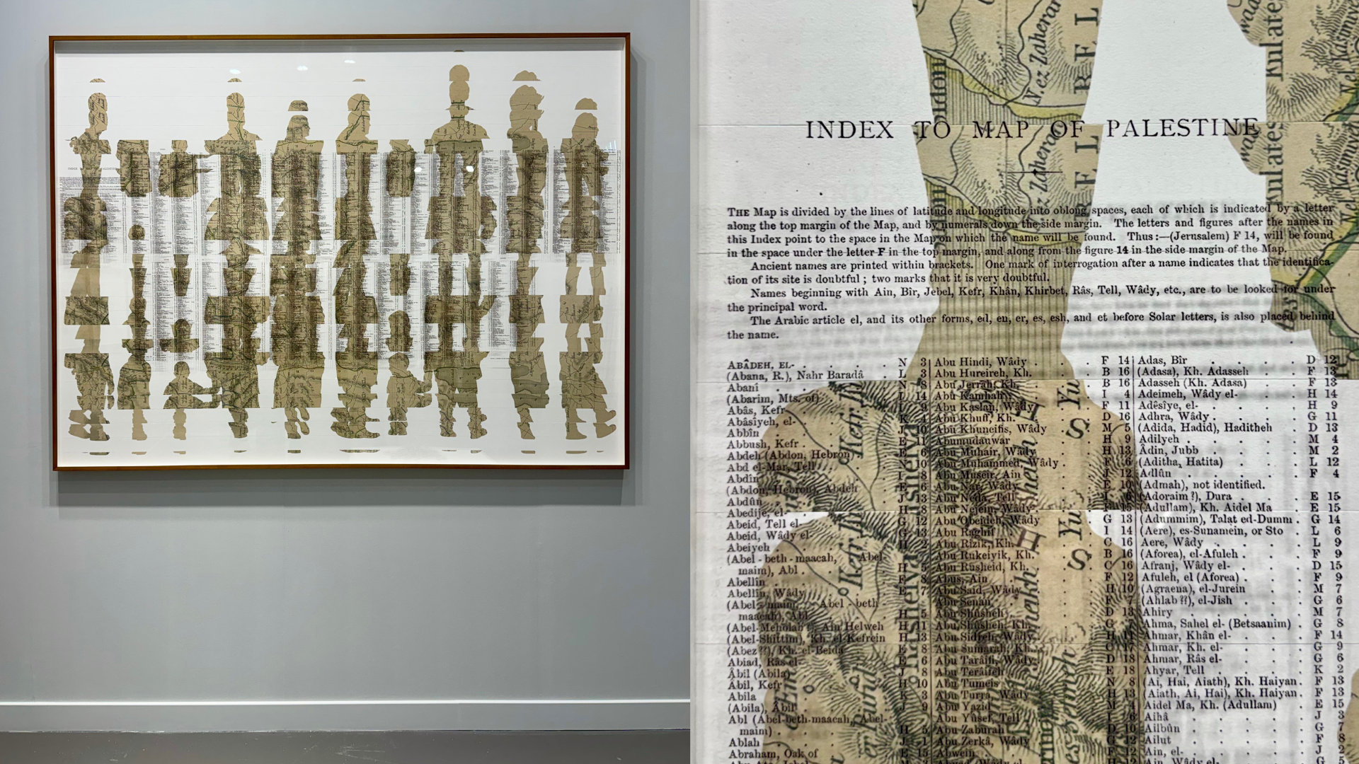 Built from fragmented historical maps of Palestine, Hazem Harb’s work dismantles cartography as a neutral language. Human silhouettes emerge from cut and layered archival material, merging bodies and territory into a single unstable surface. Borders blur, names fracture, and geography appears as something continuously imposed rather than fixed. By treating the map as both document and fiction, Harb moves away from nostalgia and instead exposes how identity, land, and power are repeatedly rewritten. Grounded in research and held within major institutional collections, this practice operates on a long historical arc—one that extends well beyond the immediacy of the fair.
