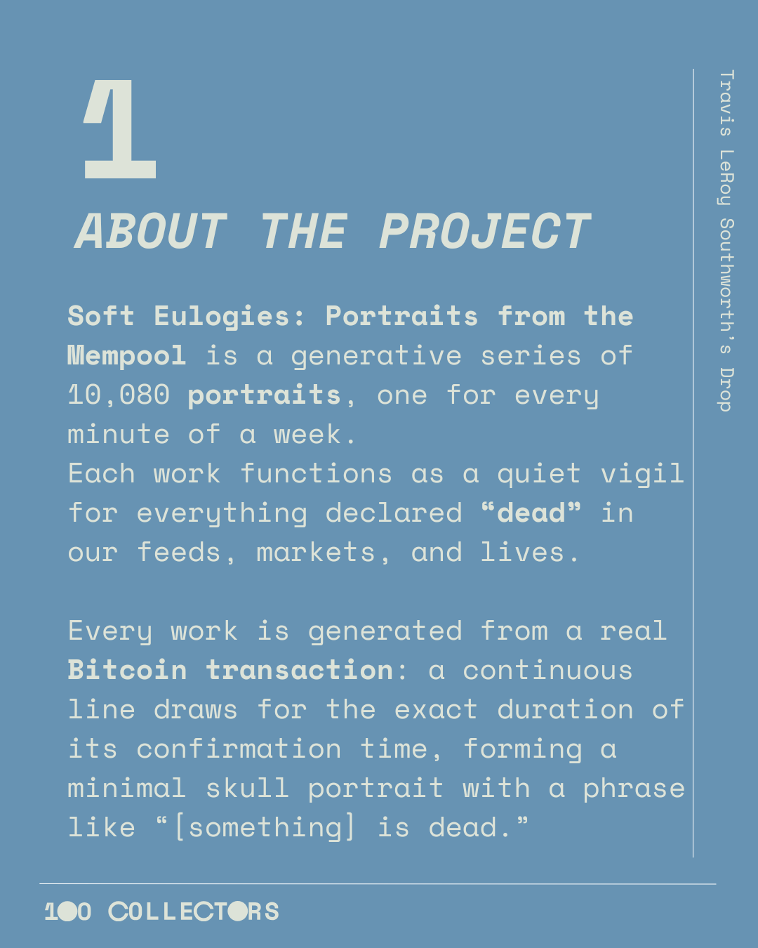 Soft Eulogies: Portraits from the Mempool is a generative series of 10,080 portraits, one for every minute of a week.