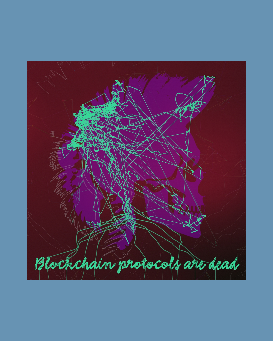 Every work is generated from a real Bitcoin transaction: a continuous line draws for the exact duration of its confirmation time, forming a minimal skull portrait with a phrase like “[something] is dead.”