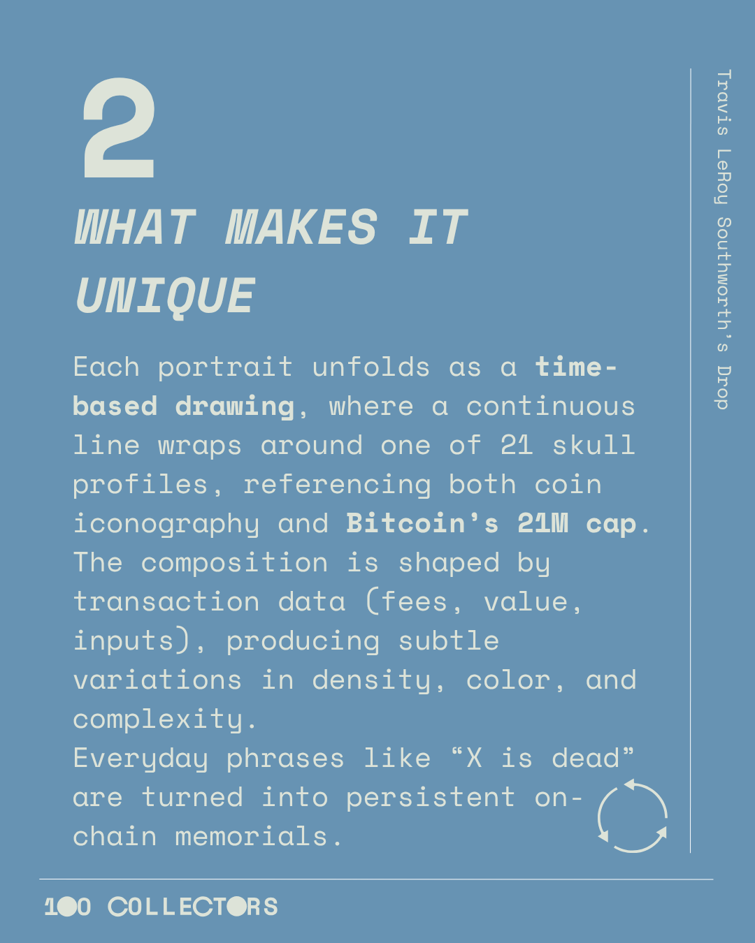 Each portrait unfolds as a time-based drawing, where a continuous line wraps around one of 21 skull profiles, referencing both coin iconography and Bitcoin’s 21M cap.