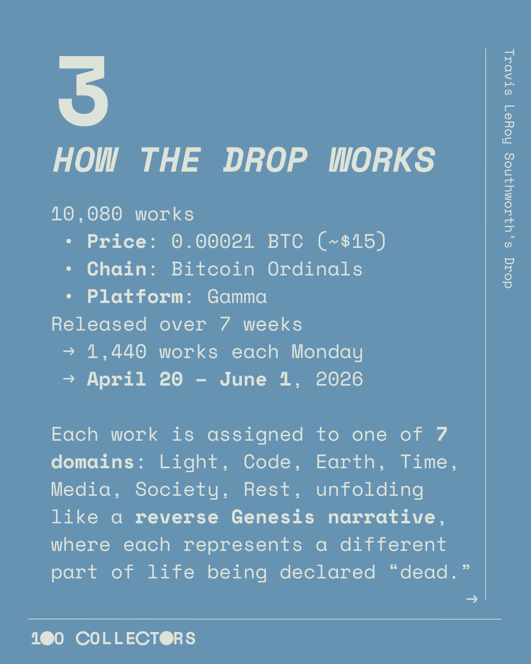 Each work is assigned to one of 7 domains: Light, Code, Earth, Time, Media, Society, Rest, unfolding like a reverse Genesis narrative, where each represents a different part of life being declared “dead.”