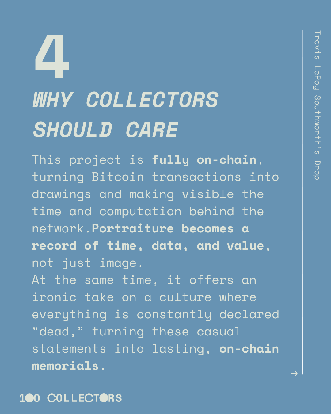 At the same time, it offers an ironic take on a culture where everything is constantly declared “dead,” turning these casual statements into lasting, on-chain memorials.