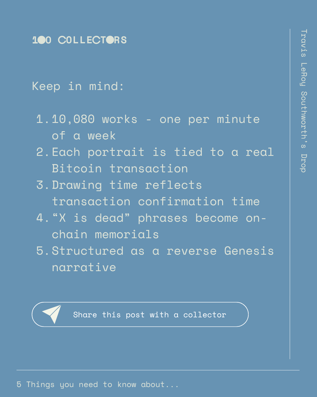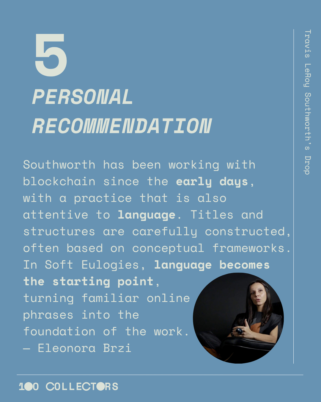 "Southworth has been working with blockchain since the early days, with a practice that is also attentive to language. Titles and structures are carefully constructed, often based on conceptual frameworks.