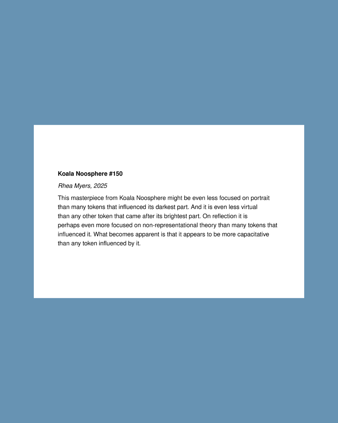 If you’re curious about how blockchain can shape an artwork’s form and meaning, Koala Noosphere uses language as material to explore ownership without full understanding, by turning this into form through a museum placard that promises clarity, then withholds it.