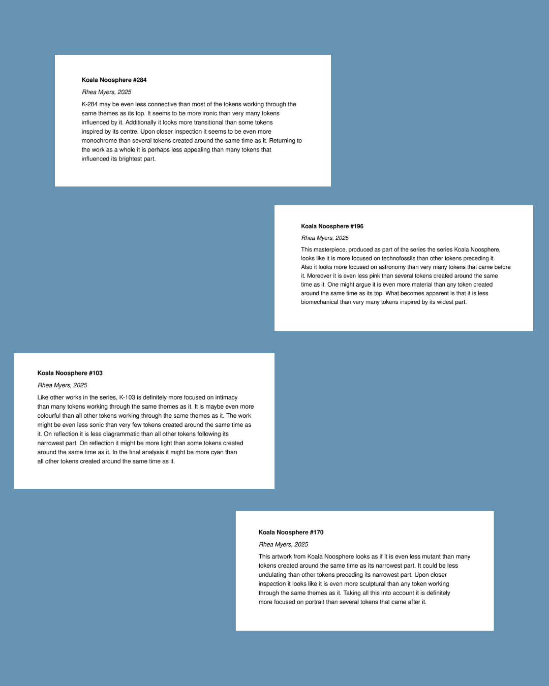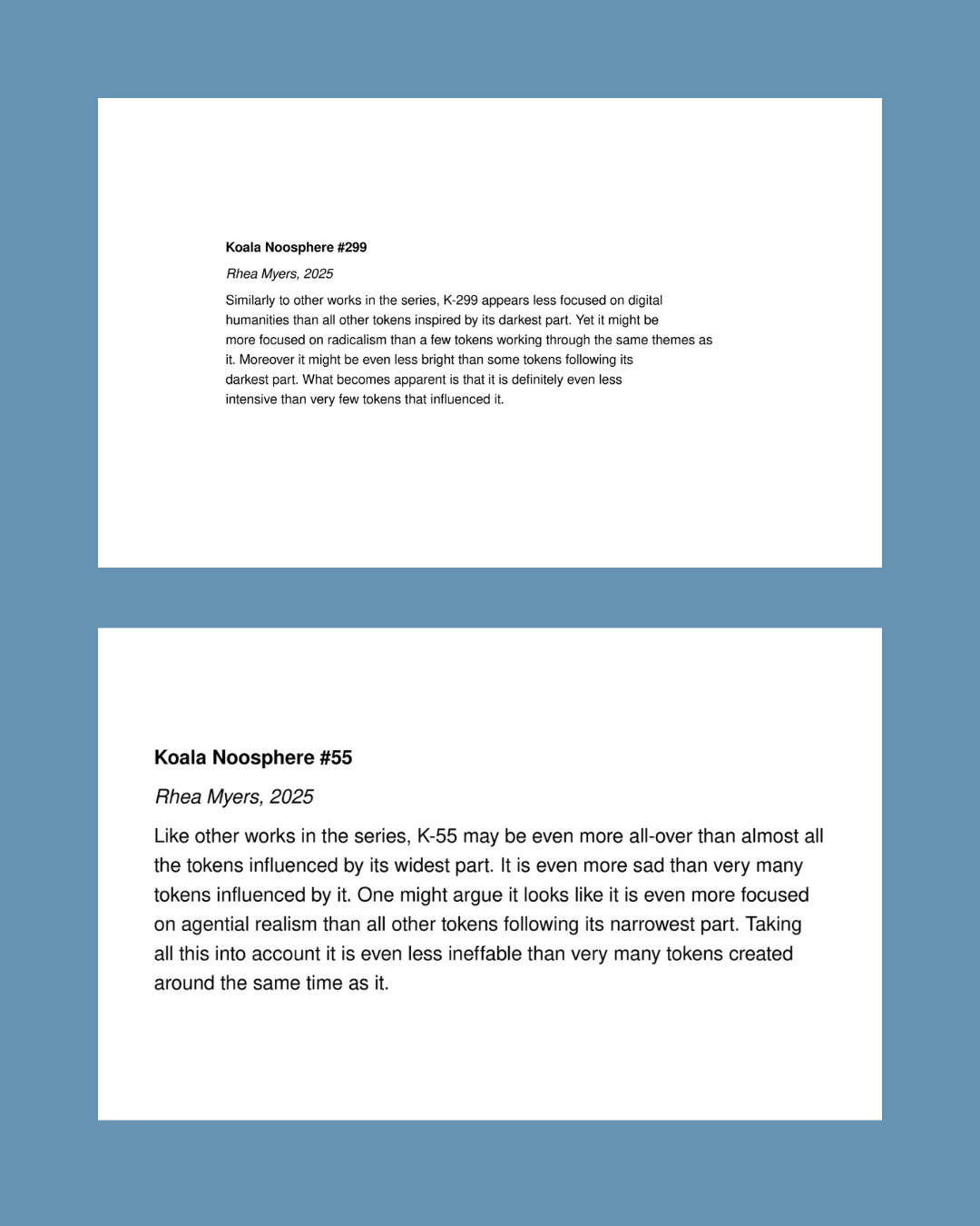 Koala Noosphere by Rhea Myers is a series of NFTs presented as museum-style placards.