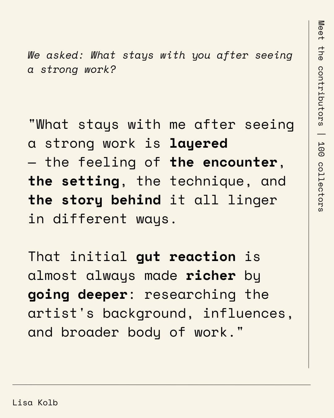 Meet Lisa here: https://www.100collectors.art/people/lisa-kolb