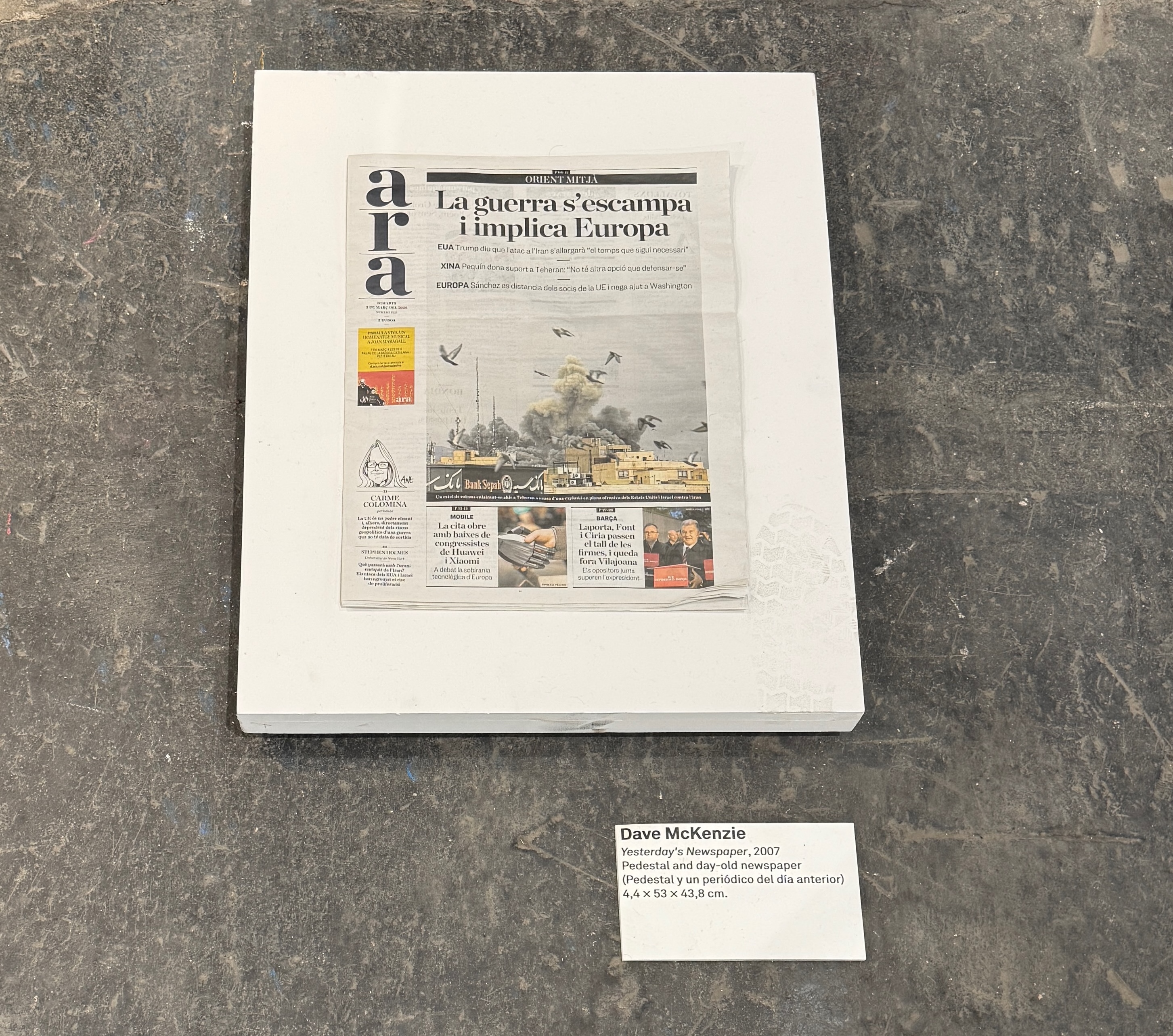 Within this context, Dave McKenzie shows Yesterday’s Newspaper (2007). The work is very simple: a pedestal displaying the previous day’s newspaper, replaced daily. What you see is always already out of date. The piece belongs to a lineage of minimal conceptual gestures, recalling artists like Felix Gonzalez-Torres who used everyday objects to mark time or absence. Here, the daily replacement of the newspaper quietly turns the sculpture into a time-based work, even though it appears static. First presented in 2007, the work reflects on how quickly information moves. Yesterday’s headlines, which felt urgent only hours earlier, already belong to the past.