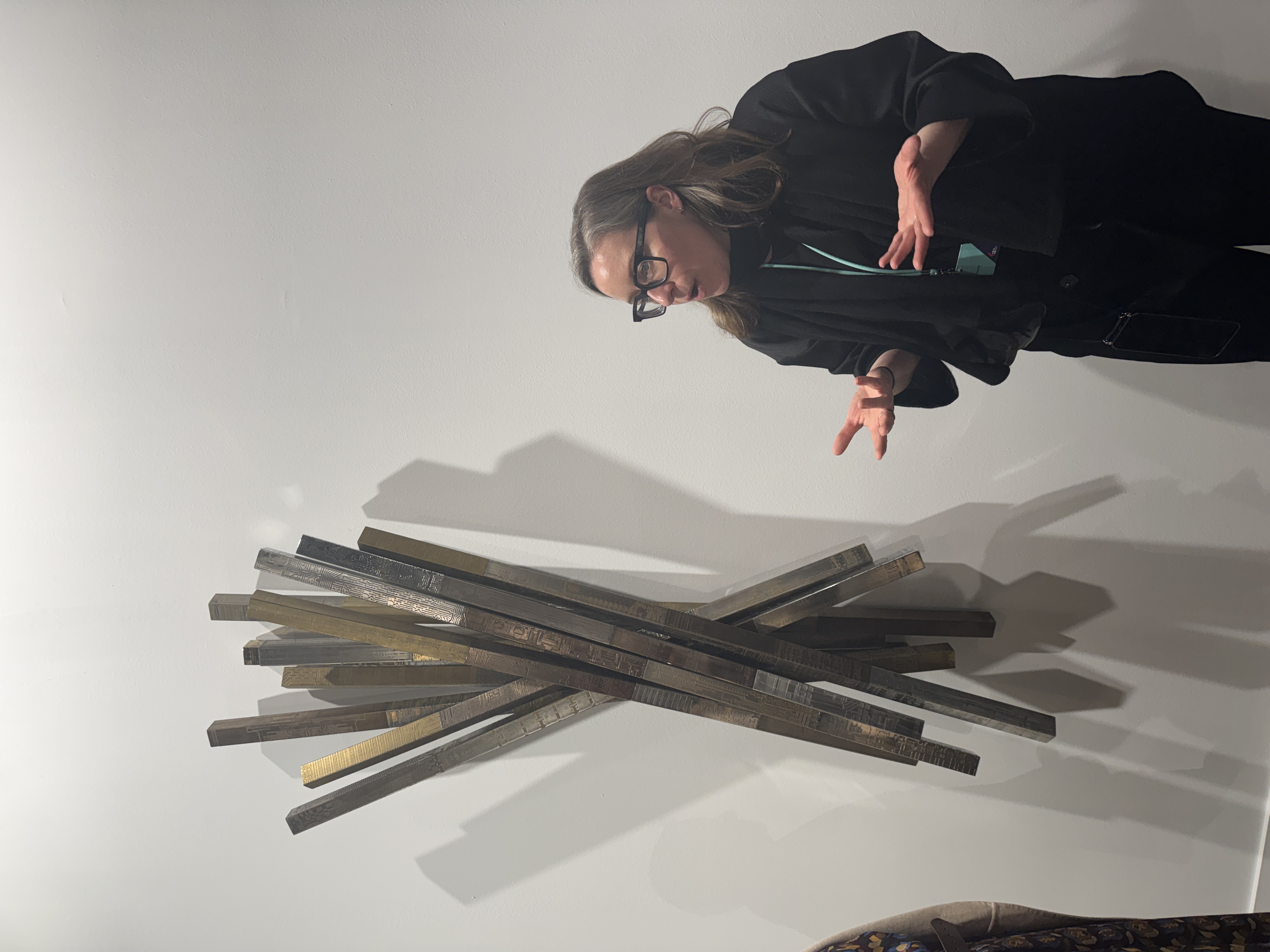 A nice surprise awaited our group at Anita Beckers. The visit started with a presentation by Anita herself of a sculpture by Daniel Canogar. Gatherings (2026) is made of stainless steel blocks acid-etched with metal patterns that depict codes and circuits. They feel familiar, like fragments of technological systems we interact with every day, yet their meaning remains unreadable. The different metals also point to the physical infrastructure behind our digital lives, materials we rarely think about even though they power the devices we use constantly.