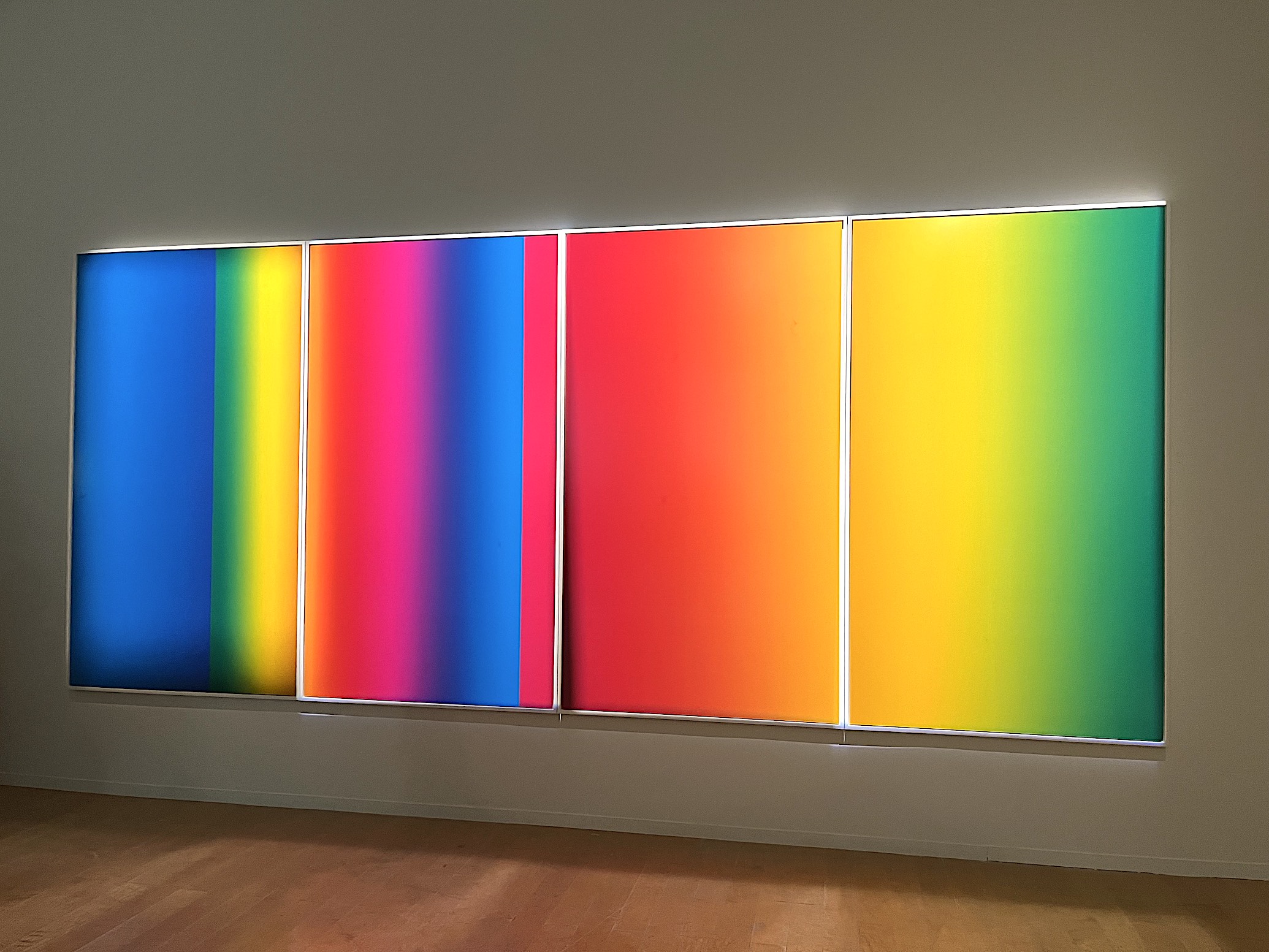 Elsewhere in the exhibition, the digital aesthetic is distilled into a single monumental image in Cory Arcangel’s Photoshop CS: 84 (2020), a large-format C-print that channels the visual language of software into a meditation on abstraction and authorship. Created using default Photoshop gradients, the work transforms a utilitarian graphic interface into a plane of luminous colour fields, recalling the emotional charge of Abstract Expressionism while firmly rooted in digital process. In its fusion of technical constraint and visual poetry, Arcangel’s piece reimagines the screen as a site of aesthetic potential—where algorithm replaces gesture, and the machine becomes a vehicle for quiet introspection.
