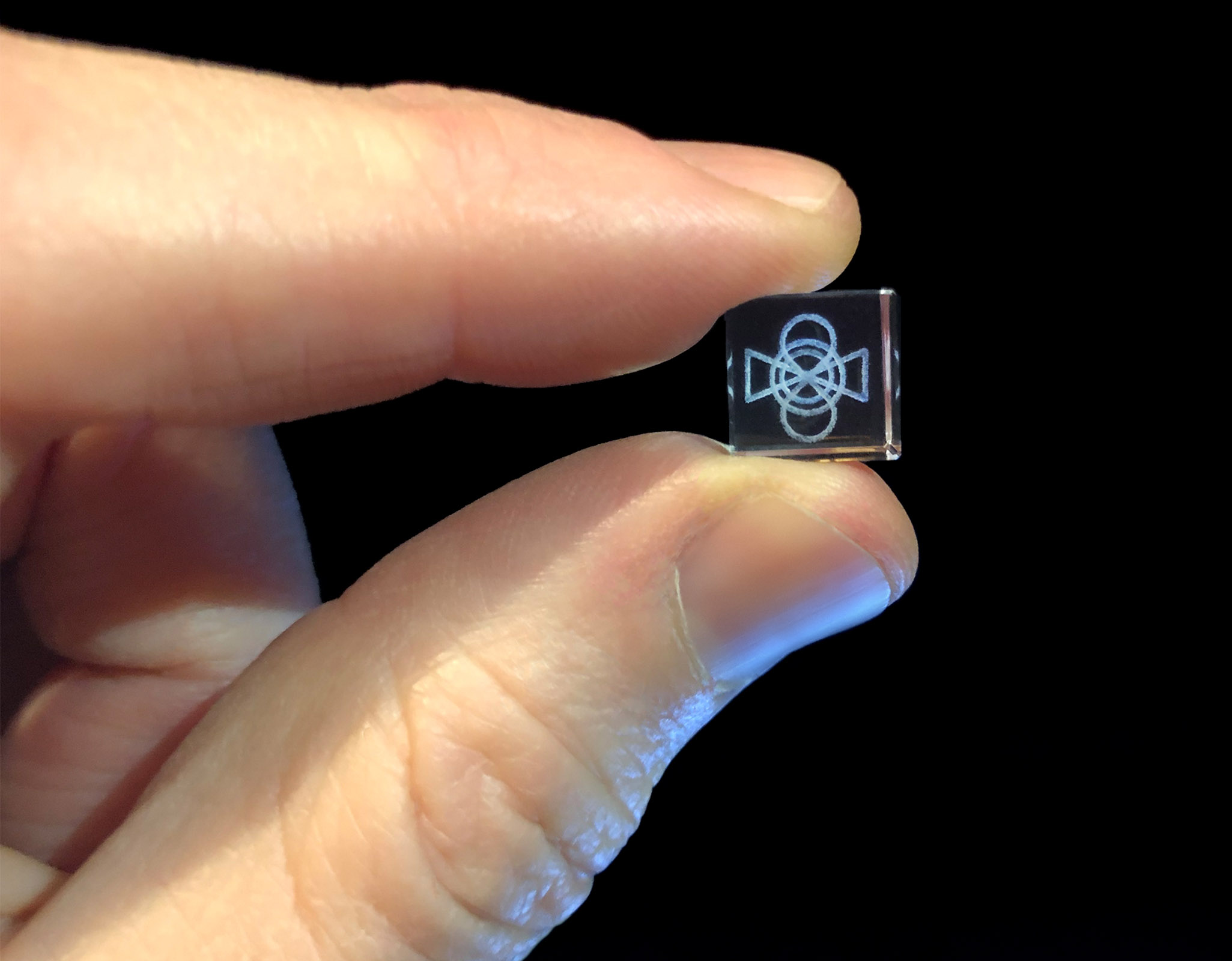 Eduardo Kac, Adsum (2019), space artwork (laser-etched optical glass), 1x1x1cm (0.39x0.39x0.39"). Adsum landed on the Moon on March 2, 2025, at 2:34 am CST. Edition of 5. Credit: Kac Studio.